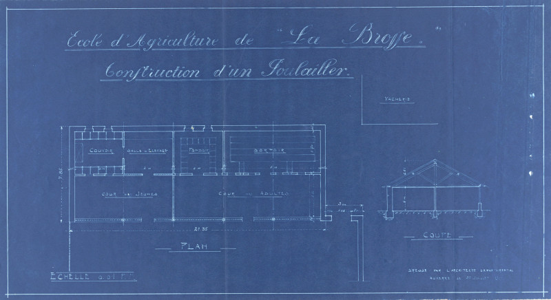 Conçu par l'architecte départemental Rousseau conformément aux indications du directeur de l'école, le poulailler est pensé pour rationaliser l'élevage des volailles, depuis leur naissance : à l'abri d'un mur de clôture formant abri contre le vent du nord, le bâtiment comporte ainsi, côté adultes, un dortoir et un pondoir ; donnant sur une cour qui leur est réservée, le quartier des jeunes dispose d'un couvoir et d'une salle d'élevage. Le devis s'élève à 20 800 francs.