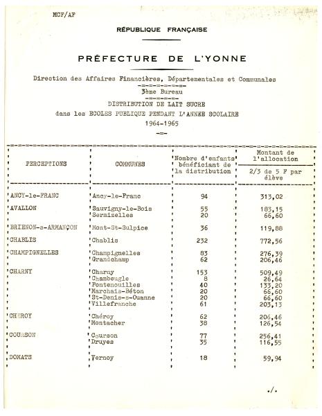 Tableau statistique relatif à la distribution aux enfants des écoles de lait et de sucre dans l'Yonne. 13 décembre 1965. Arch. dép. Yonne, 100 W 17324.