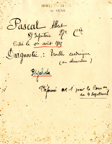 Le 9 septembre 1915, le soldat Albert Pascal quittait l’hôpital de Sens. Il y laissait, comme trace de son passage, un dossier médical qui, outre des informations thérapeutiques, contient un poignant manuscrit de quelques pages où il raconte un parcours à la guerre, bien singulier.