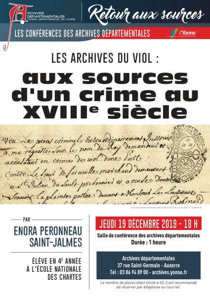 Dans le cadre de leur cycle de conférences "Retour aux sources", les archives départementales de l'Yonne ont proposé le 19 décembre 2019 une intervention d’Énora Peronneau Saint-Jalmes, élève en 4e année à l’École nationale des chartes et lauréate de la bourse de recherches du conseil départemental de l’Yonne sur le thème suivant : "Les archives du viol : aux sources d'un crime au XVIIIe siècle".