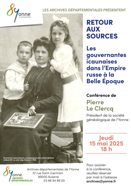 Dans le cadre de leur cycle de conférences "Retour aux sources", les archives départementales de l'Yonne proposent une intervention de Pierre Le Clercq, président de la société généalogique de l’Yonne, sur le thème : "Les gouvernantes icaunaises dans l’Empire russe à la Belle Époque".