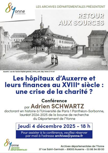 Dans le cadre de leur cycle de conférences « Retour aux sources », les Archives départementales de l'Yonne proposent une intervention d’Adrien SCHWARTZ, doctorant en histoire à l’Université de Paris 1 Panthéon-Sorbonne, lauréat 2024-2025 de la bourse de recherche du Conseil départemental de l’Yonne, sur le thème : Les hôpitaux d’Auxerre et leurs finances au XVIIIe siècle : une crise de la charité ?