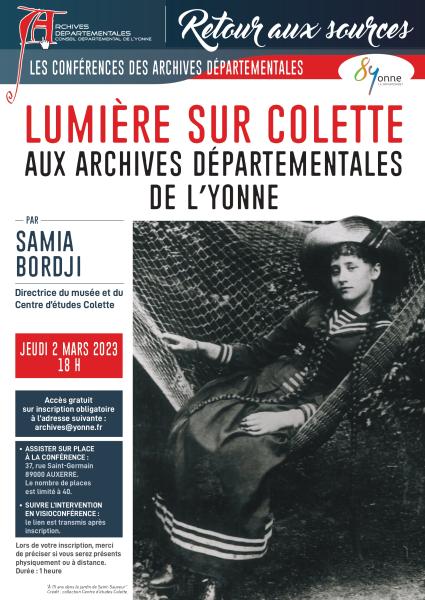 Dans le cadre de leur cycle de conférences "Retour aux sources", les archives départementales de l'Yonne ont proposé le 2 mars 2023 une intervention de Samia Bordji, directrice du musée et du centre d'études Colette, sur le thème suivant : "Lumière sur Colette".