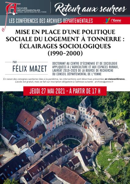 Dans le cadre de leur cycle de conférences "Retour aux sources", les archives départementales de l'Yonne ont proposé le 27 mai 2021 une intervention de Félix Mazet, doctorant au centre d’économie et de sociologie appliquées à l’agriculture et aux espaces ruraux, lauréat 2019-2020 de la bourse de recherches du conseil départemental de l’Yonne, sur le thème suivant : "Mise en place d'une politique sociale du logement à Tonnerre : éclairages sociologiques (1990-2000)".