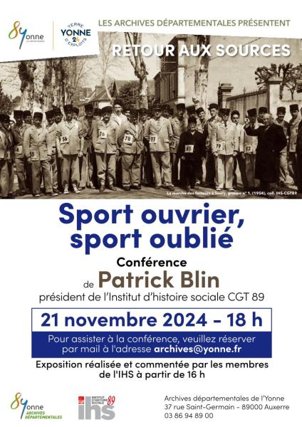 Dans le cadre de leur cycle de conférences "Retour aux sources" les Archives départementales de l'Yonne ont proposé le 21 novembre 2024 une intervention de Patrick Blin, président de l’Institut d’histoire sociale CGT 89 sur le thème "Sport ouvrier, sport oublié".