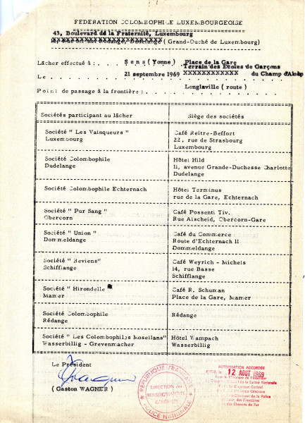 Liste des participants au lâcher de pigeons voyageurs belges et luxembourgeois. 21 septembre 1969. Arch. dép. Yonne, 1007 W 164.