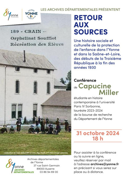 Dans le cadre de leur cycle de conférences "Retour aux sources", les Archives départementales de l'Yonne ont proposé, le 31 octobre 2024, une intervention de Capucine Miller, étudiante en histoire contemporaine à l’université Paris IV Sorbonne, lauréate 2023-2024 de la bourse de recherche du Conseil départemental de l’Yonne sur le thème : "Une histoire sociale et culturelle de la protection de l’enfance dans l’Yonne et dans la Saône-et-Loire, des débuts de la Troisième République à la fin des années 1930".